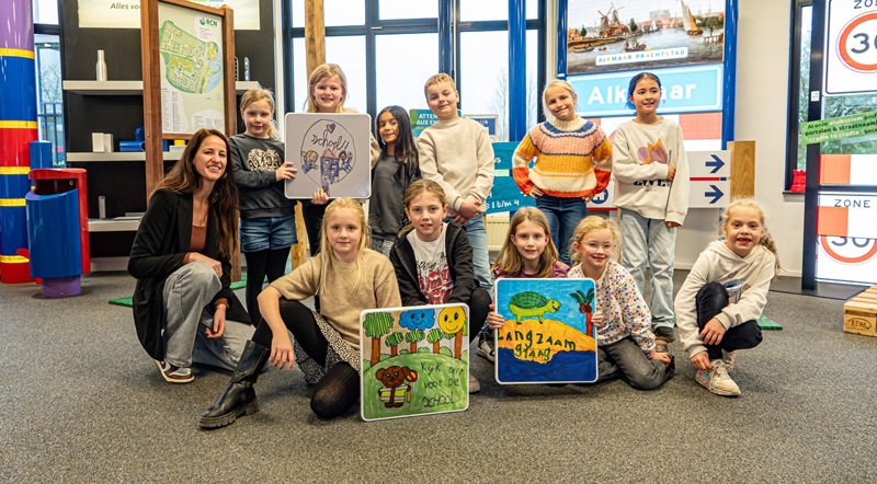 Drie scholieren die als winnaar uit de bus zijn gekomen van een tekenwedstrijd die door garageformule CarProf is georganiseerd in samenwerking met POL Heteren, leverancier van allerlei producten rondom verkeer en veiligheid, hebben hun tekening als verkeersbord overhandigd gekregen.