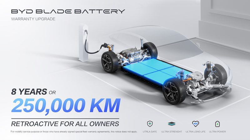 De Chinese fabrikant van elektrische auto’s BYD heeft de garantie op zijn zogeheten Blade Batteries uitgebreid van 6 naar 8 jaar, of 250.000 kilometer in plaats van 150.000 kilometer.