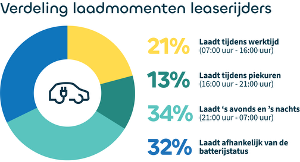 13 procent van de leaserijders laadt tijdens piekuren, en bij 32 procent van de leaserijders hangt het tijdstip van laden af van de batterijstatus. Van de laatste groep geeft 86 procent aan tijdens piekuren te laden wanneer de batterij erom vraagt. Daarmee komt het totale aandeel leaserijders dat tijdens piekuren laadt, uit op 41 procent.