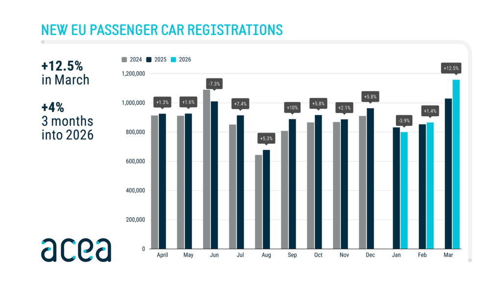 De autoverkopen in Europa zijn in het eerste kwartaal van 2026 met 4 procent gestegen. De groei in nieuwe registraties komt vooral door een sterke maand maart, waarin de vraag naar elektrische auto’s in Europa met circa 50 procent toenam ten opzichte van een jaar eerder.