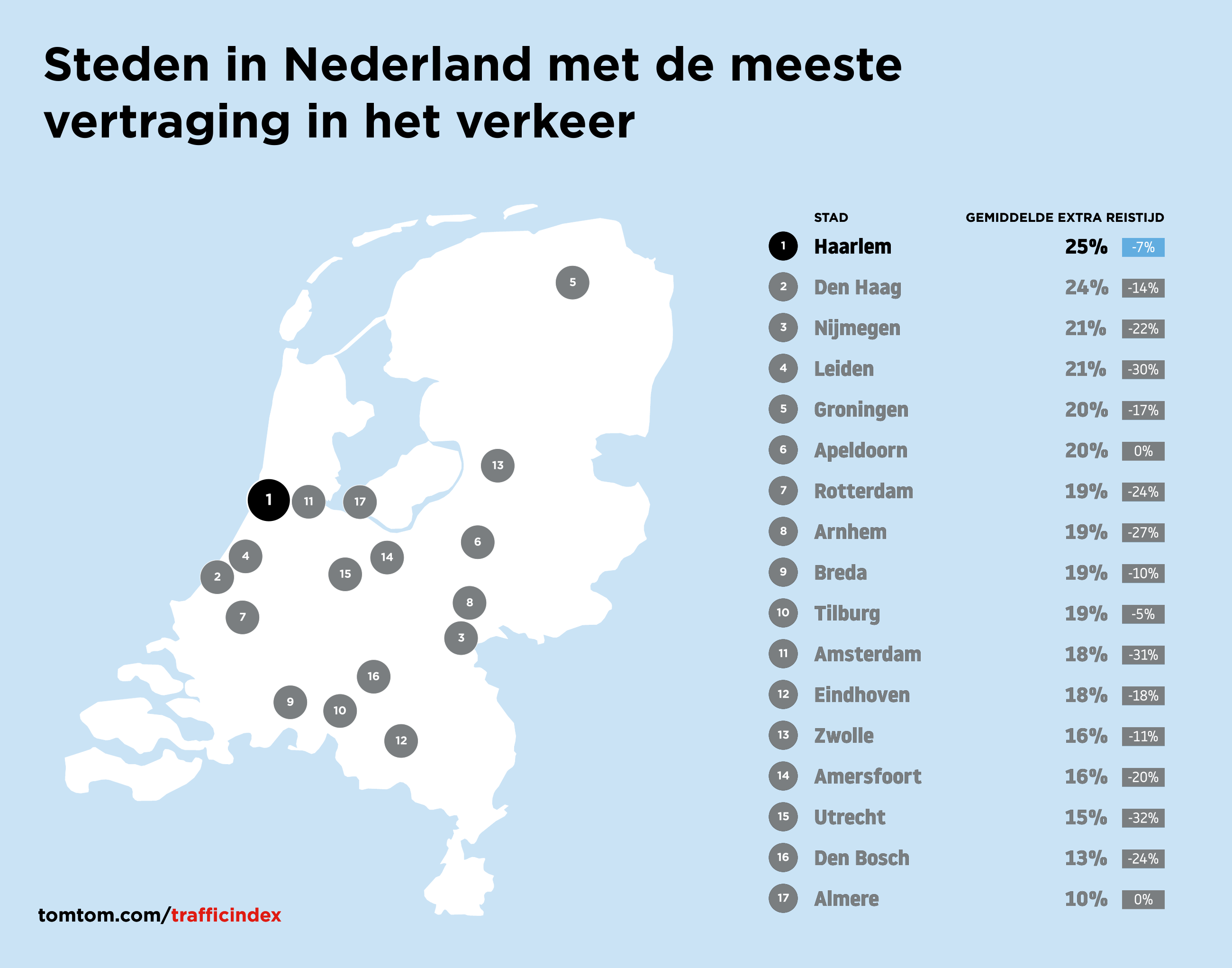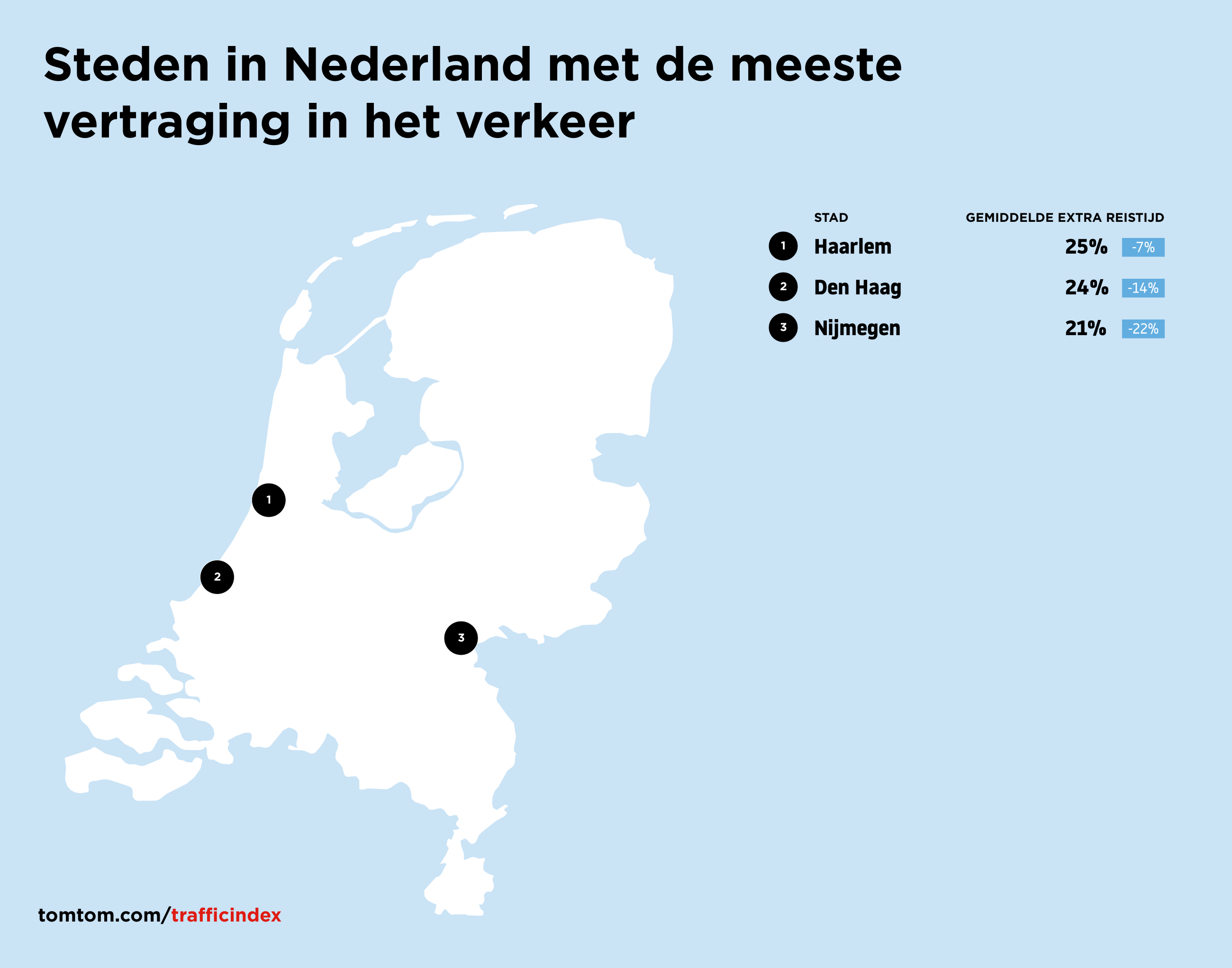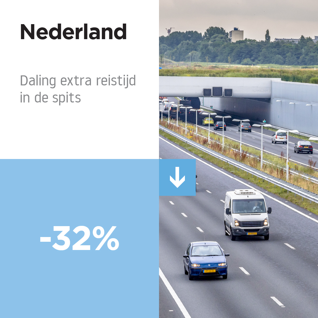 Specifiek voor Nederland blijkt dat de gemiddelde extra reistijd in de Nederlandse steden in 2020 met 17 procent is gedaald ten opzichte van 2019. Leiden, Amsterdam en Utrecht zagen met respectievelijk -30, -31 en -32 procent de grootste dalingen. In de spits was de afname hier met respectievelijk -39, -43 en -47 procent zelfs nog groter.