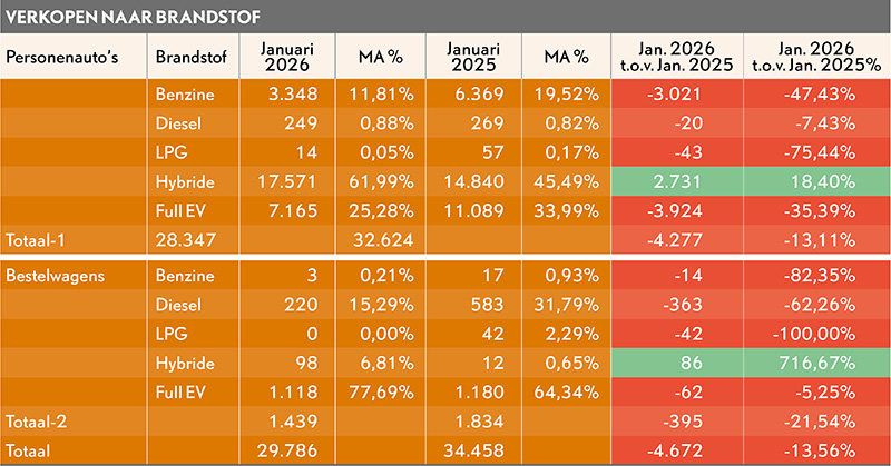 De registratiecijfers van het RDC (januari 2026) vertonen over de eerste maand van 2026 opvallend veel minnen ten opzichte van vorig jaar: minder nieuwe personenauto’s, waaronder minder EV’s, minder apk’s en minder occasion-overschrijvingen, al worden de registratiecijfers van nieuwe personenauto’s deels beïnvloed door de belasting gedreven eindspurt in december vorig jaar.