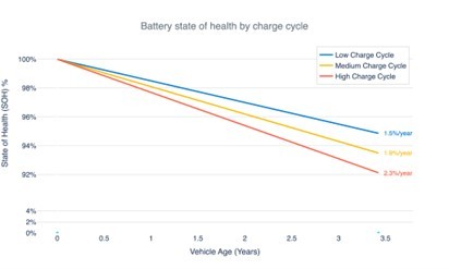 Voertuigen die vaker snelladen boven 100 kW vertoonden een snellere achteruitgang, gemiddeld tot 3 procent per jaar. Bij voertuigen die voornamelijk laden met AC- of lager vermogen daalt de gezondheid van de batterij met ongeveer 1,5 procent per jaar.