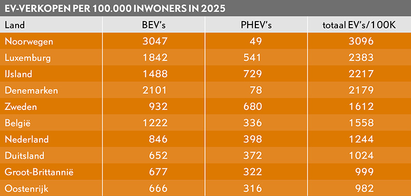 De EV-transitie maakt nog altijd een belangrijk deel uit van wat er nog over is van de Green Deal, helaas zwakt de vraag naar elektrische personenauto’s af. Die vraag heeft overigens niet een uniform karakter, blijkt uit cijfers van Tradingpedia, waar analisten de Europese EV-transitie nauwgezet volgen. Voor hen is de acceptatie van de EV per hoofd van de bevolking een belangrijke indicator voor het succes van de EV-transitie op Europese schaal. Het Europese EV-landschap liet in 2025 een discrepantie zien tussen de verkoopaantallen van batterij-elektrische en plug-in hybride elektrische voertuigen (BEV en PHEV) en de adoptie van EV’s op consumentenniveau, zakelijk en particulier. Duitsland, Groot-Brittannië en Frankrijk leken vorig jaar op papier de marktleiders bij de elektrificatie met respectievelijk 856.540, 698.491 en 425.549 verkochte nieuwe elektrische auto’s, maar hun acceptatie per hoofd van de bevolking vertelt een ander verhaal (zie kader).