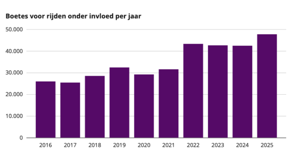 Afgelopen jaar zijn er in Nederland bijna 48.000 boetes uitgeschreven voor rijden onder invloed. Er werden nog nooit zoveel bekeuringen uitgedeeld voor dit vergrijp en het waren er bijna 22.000 meer dan 10 jaar geleden.