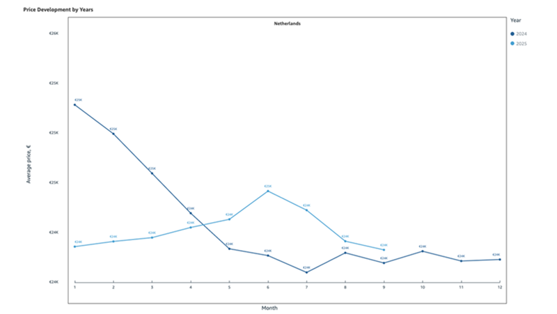 De gemiddelde vraagprijs voor een occasion op het verkoopplatform was in september 2025 24.196 euro. Dit is 0,22 procent lager dan in augustus (24.249 euro). Ten opzichte van september 2024 ligt de gemiddelde occasionprijs nog maar 79 euro hoger.
