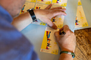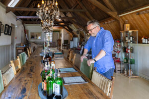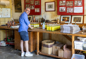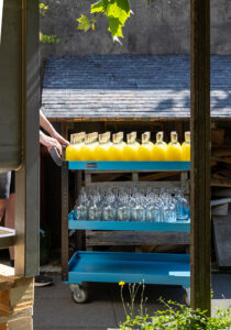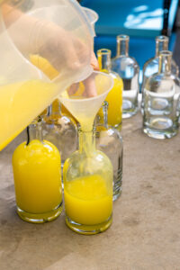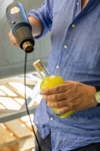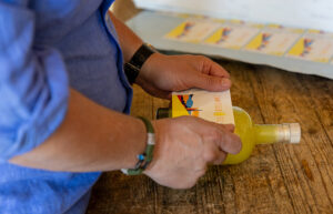 Ivar beschrijft het proces alsof iedereen met een citroen en wat alcohol een overheerlijke limoncello kan maken. Zo werkt het natuurlijk niet: “Je begint met het mengen van de alcohol en de gele schil van de citroen. Dat schillen gebeurt zogezegd met de hand. Doe het vooral niet te dik, want het witte van de citroen smaakt behoorlijk bitter. Vervolgens voeg je suikerwater toe, heel veel suikerwater. Om je een idee te geven: voor deze batch, nummer 6 alweer – in totaal zijn het 205 flessen vandaag – gebruiken we bijna 30 kilo suiker. Deze batch, we hebben er twee per jaar, is wat kleiner ditmaal. Waarom? We zijn een erg leuke en succesvolle samenwerking aangegaan met de Veluwse brouwerij Hert Bier (zie Buiten Kantooruren 02/2019 met Johan Graveland, MR). Een deel van de limoncello is gebruikt voor een nieuw speciaalbiertje, Limon Ciao geheten. Dus je ziet, de mogelijkheden met limoncello zijn nagenoeg eindeloos.”