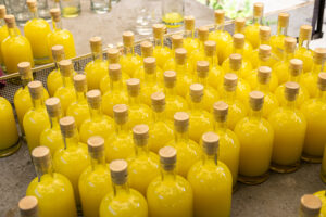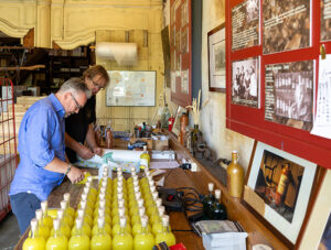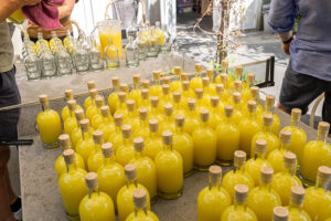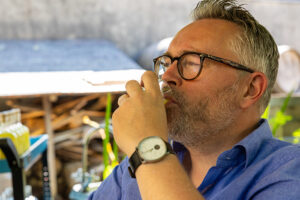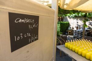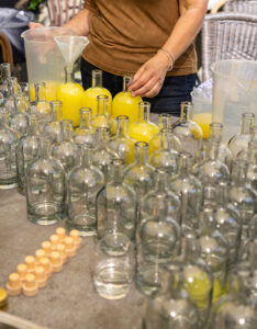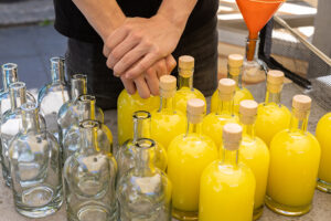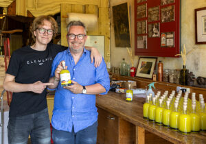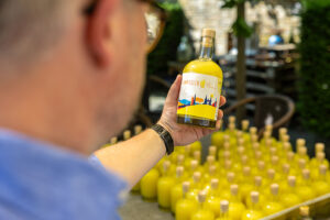 In de binnentuin van destilleerderij Weduwe Joustra in Sneek is het net ‘Klein Italië’. Het kwik tikt nipt de dertig graden aan, er klinkt gerinkel van lege flessen, her en der liggen vellen vol kleurige etiketten. Kannen vol fluorescerend gele vloeistof staan klaar om gulzig uitgeschonken te worden. Ivar Camps heeft vandaag zijn zoon, zus en zwager meegebracht als slagvaardige hulptroepen. Zijn zus, fluisterend: “Ivar moet soms een beetje worden afgeremd in zijn enthousiasme. En daar ben ik dan weer heel goed in.” Glimlachend gaat ze verder met het afvullen van de in totaal 205 lege nog etiketloze flessen. Eenmaal gezeten onder een verkoelend schaduwdoek steekt Ivar van wal en vertelt hij hoe zijn limoncello-avontuur begon.