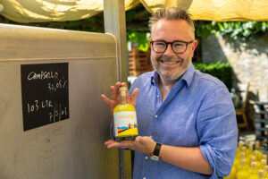 Door corona had Ivar extra tijd te besteden aan zijn ‘Campsello-project’. Ik werkte veel thuis, maar ook veel in Sneek waar mijn schoonouders een huisje hebben. In die tijd kwam ik in contact met ijssalon MIN12 uit Sneek. Altijd al was ik dol op hun heerlijke ijs, dus ik had ze een fles limoncello beloofd. Op weg naar hem ging ik nog even langs bij Weduwe Joustra, die een paar panden verderop zit en bekend is van het drankje Beerenburg. Daar ontmoette ik bedrijfsleider Steve Sibson. Nadat hij de limoncello had geproefd en zei: ‘Dat is best goed spul’ – wilde hij wel een avontuur met mij aangaan. De samenwerking met twee Friese ondernemingen was geboren. Ivar levert de citroenen en Weduwe Joustra de grondstoffen terwijl bij MIN12 de likeur wordt gemaakt. Het citroensap wordt vervolgens gebruikt bij het maken van ijs.”