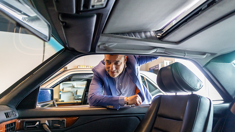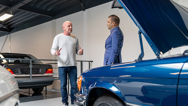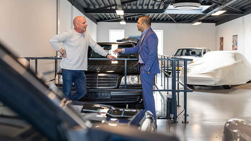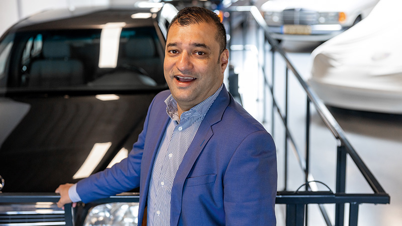 De absolute basis voor zijn autoliefde ligt in Vishals kindertijd. Hij oogt dan ook als een kind zo blij als we rondlopen langs wat parels van ‘Mister Youngtimer’ Marco Hof, in diens Amstelveense snoepwinkel. Vishal mocht de locatie kiezen voor dit interview en gelijk noemde hij de naam van Hof. Tijdens een kop koffie steekt hij van wal: “In mijn jonge jaren was mijn vader best wel een autoliefhebber, maar hij handelde strikt vanuit budgettaire overwegingen. Zijn eerste auto was een Datsun 120Y waar ik geen warme herinneringen aan heb, ik vond dat toen al een saaie auto. Ik trok op jonge leeftijd al een belangrijke conclusie: ik zou zelf nooit concessies doen als het op autorijden aankomt. Na een bescheiden Mazda 323 kocht ik als 19-jarige mijn eerste echte rijdersauto: een BMW E34 525i, mét 6-cilinder. Toen ik daarvan had geproefd was het hek definitief van de dam.”