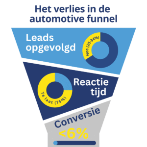 In 2021 zag #DCDW dat slechts 66% van de leads werd opgevolgd, met een gemiddelde reactietijd van meer dan zeven uur. In 2024 bleek opnieuw dat 25% van de aanvragen nooit wordt opgevolgd, driekwart te laat wordt beantwoord en de conversie onder de 6% blijft. Niet door een tekort aan leads, maar door een gebrek aan structuur. Ook internationaal is dit zichtbaar: Autotrader in de VS koppelde slechte leadopvolging direct aan lagere conversie en hoger personeelsverloop.