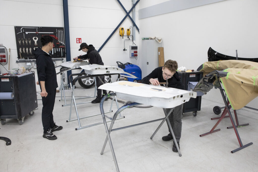 Aan de andere kant van het spectrum stond Bas Ooteman, gepensioneerd schademonteur, die de leerlingen liet delen in zijn meer dan vijftigjarige ervaring met plaatwerk: uitdeuken, plamuren en schuren.