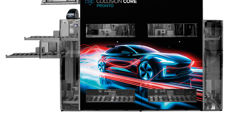 De nieuwe geautomatiseerde verfdispenser Pronto die onderdeel uitmaakt van het Collision Core System krijgt de nodige aandacht. Hij is leverbaar in twee versies, CR4 of CR6. Het cijfer slaat op het aantal doseerkoppen, vier of zes dus en daarmee op het aantal kleuren dat de machine gelijktijdig kan mengen. De leverancier rekent voor dat daarmee bijna 200 kleuren per dag gemengd kunnen worden en 24 formules per uur. Omdat het systeem volledig geautomatiseerd is, hoeft de gebruiker niet meer met de hand te mengen, reinigen of te kalibreren. Dit betekent ook dat het niet per se door de spuiter zelf gedaan hoeft te worden. In principe kan iedereen het immers.