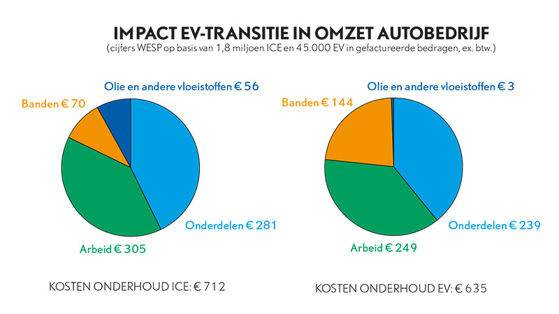 Bas Wintjes, directeur van WESP, dat van meer dan drieduizend autobedrijven de werkplaatsfacturen vergelijkt en uitstekend kan zien wat een autobedrijf verdient aan de verkoop van uren en onderdelen voor zowel elektrische auto’s (EV) als auto’s met een verbrandingsmotor (ICE), stelt dat er voor het autobedrijf niet zoveel aan de hand is wanneer EV’s in de plaats komen van ICE-auto’s. “Niks! Het autobedrijf is een urenfabriek, die ook een beetje verdient aan de verkoop van onderdelen, maar dat is op te vangen met het uurloon.”