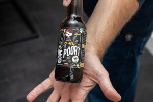 “Maar goed, bij een serieus bier hoort ook een serieus etiket-ontwerp. Ook dat mocht beslist geen fröbelwerk zijn. Op een dag kom ik in ons mooie stadje Jeroen Harzing tegen, ook hij heeft een zwak voor Oudewater. Jeroen heeft bovendien een Oudewaters reclamebureau en draagt de stad net als ik een warm hart toe. Hij zei: ‘Joh, wij gaan iets moois voor je ontwerpen, want we moeten Stadsbrouwerij Oudewater meteen goed neerzetten. Toen stond daar ineens een merk, een echt serieus merk! En wat denk je, het sloeg meteen al heel erg goed aan.”