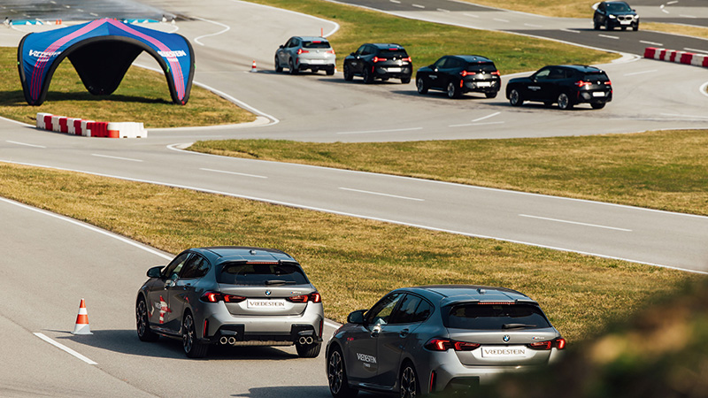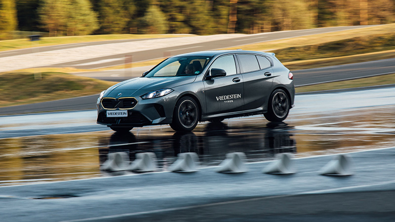 Met de nieuw ontwikkelde all-seasonband mikt Apollo Vredestein op sportwagens, high-performance auto’s, grote (zware) SUV’s en EV’s. Die laatste twee autocategorieën worden alsmaar populairder, dus zo gek is dat niet. Ook snelle hatchbacks behoren tot de doelgroep, zoals de M135 xDrive waarmee we op het punt staan met 85 kilometer per uur over een bewegende plaat te rijden.