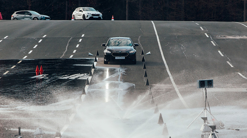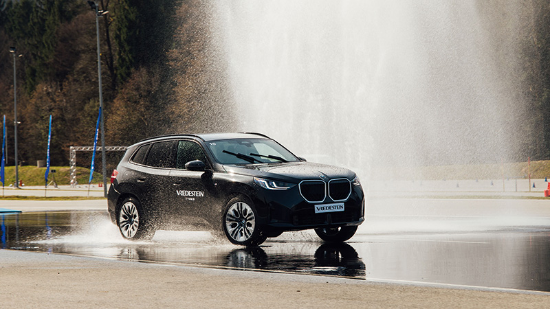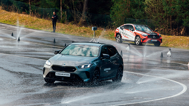 Die plaat duwt de auto plotseling heftig opzij, waarna het de kunst is om de BMW in het gareel te houden en zijn weg te laten vervolgen zonder van de baan te raken, vertelt de Vredestein-instructeur ons. ‘Klein’ detail: de baan is kletsnat van de regen. Aquaplaning ligt op de loer en tot overmaat van ramp schieten barrières van opspattend water lukraak uit de grond. Die moeten we zien te ontwijken, want als we die raken zijn we af. Of zoals de rijinstructeur het verwoordt: “dood”.