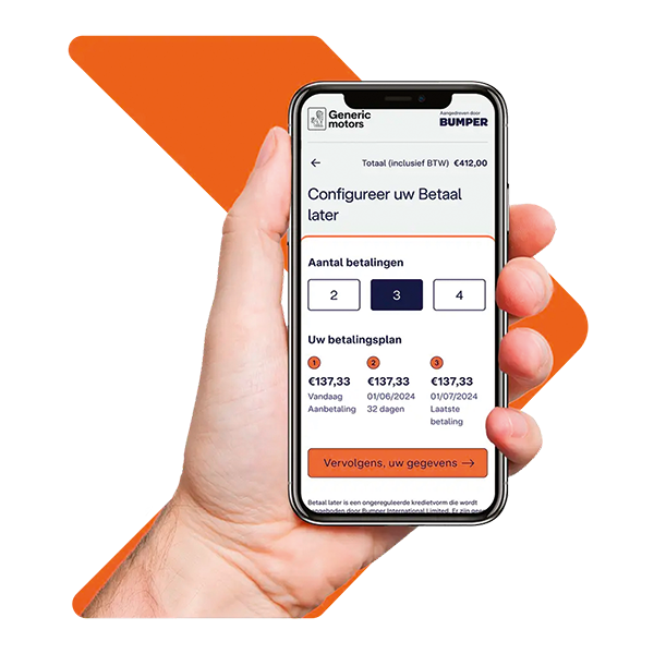 Bumper is een betaalplatform, waar enkele autofabrikanten als investeerders bij betrokken zijn, dat verschillende betaaloplossingen biedt, waaronder uitgesteld betalen (tot dertig dagen) en het zogeheten buy now, pay later, voor betalingen vanaf 60 euro. Hierbij kiest de klant zelf in hoeveel gelijke termijnen hij het bedrag wil betalen: twee, drie of vier. In dat geval betaalt Bumper de aangesloten autobedrijven het volledige bedrag ineens; de klant betaalt Bumper in gelijke termijnen, zonder rente. Zelfs wanbetalers krijgen bij het missen van een termijn niet direct een boete opgelegd. Key accountmanager bij Bumper Joshua Landvreugd: “Als iemand het echt heel bont maakt, zetten we een 12 euro administration fee in, maar eerst gaan we met de klant in gesprek en zoeken we naar een oplossing. Ik heb een klant bij een grote dealergroep die al anderhalf jaar vijftig euro per maand betaalt. Het houdt een bepaald risico in, inderdaad. Dat is ook de reden dat we onze focus hebben op merkdealers. Daar zit minder risico. En voor de dealers is het een extra tool om ook de oudere auto’s binnen te krijgen. Ze zijn misschien iets duurder dan de universeel, maar door gespreide betaling aan te bieden maken ze ook voor de oudere auto’s dealeronderhoud betaalbaar, waarmee de auto zijn waarde behoudt.”