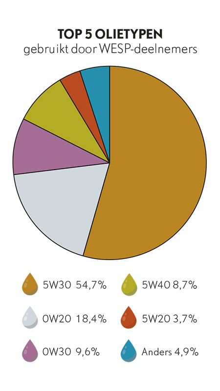 Soms verandert een olieadvies, zoals in het geval van Stellantis in 2024-2025. Werd voor een aantal motoren een 0W-30 dan wel een 0W-20 voorgeschreven, na een recall beval Stellantis juist weer een 5W-30 voor diezelfde motoren aan, zelfs voor de 1.2 liter Puretech-motor (met uitzondering van de EB2LT-motor) en voor de 2.2 liter DW10Fx-motoren. Sowieso is een volledig synthetische 5W0-30 een soort ‘Haarlemmerolie’: breed inzetbaar voor zowel benzine- als dieselmotoren. Niet voor niets blijkt uit de WESP-data (zie taartdiagram) dat dit het meest gebruikte olietype in de werkplaats is.